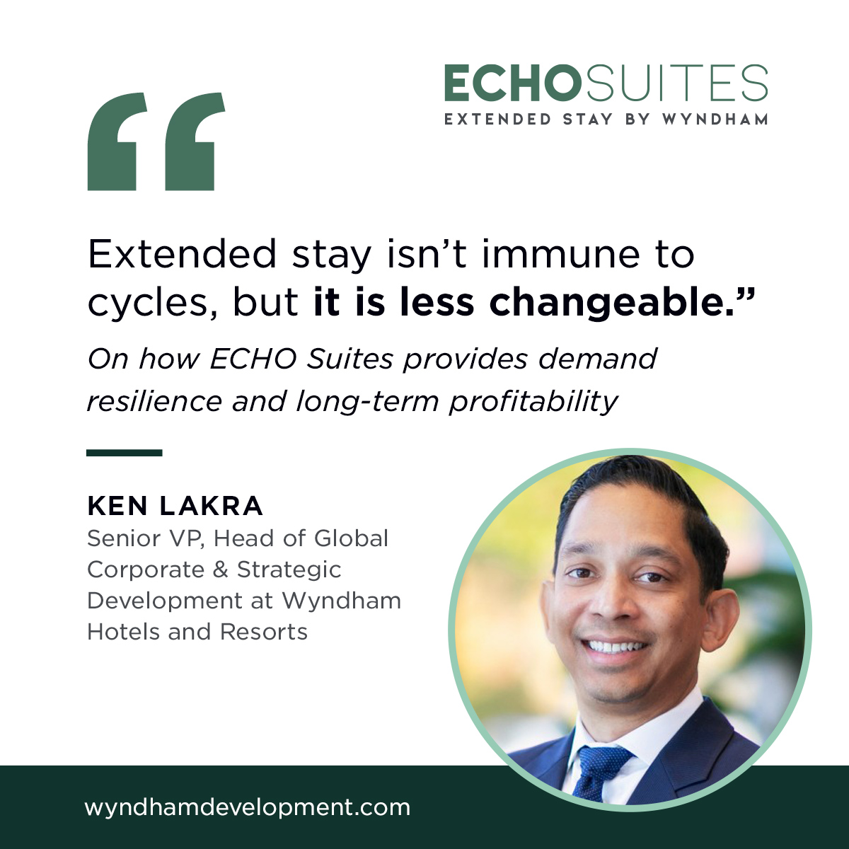 For many owners, this raises a question: When is the right time to take on an extended-stay build? We caught up with Keith Harris, VP, Architecture, Design, and Construction, and Ken Lakra, Senior VP, Head of Global Corporate & Strategic Development at Wyndham Hotels and Resorts, to explore the strategic opportunities offered by ECHO Suites Extended Stay by Wyndham properties.